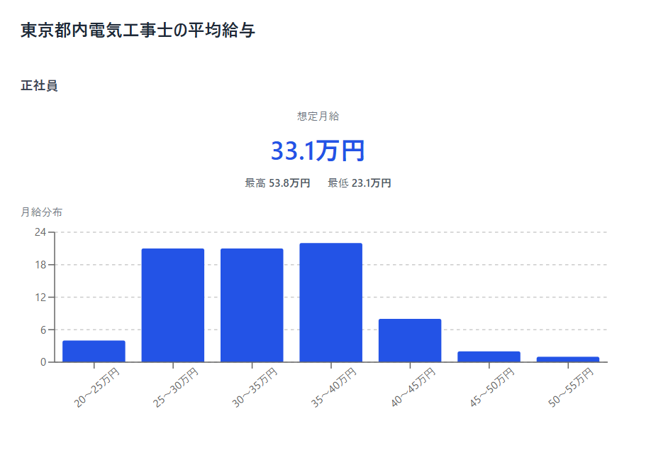 次に無視できないのが「場所」の要因です。東京都内の電気工事士(正社員)の想定月給平均は33.1万円であり、地方と比較して明らかに高い水準にあります。
